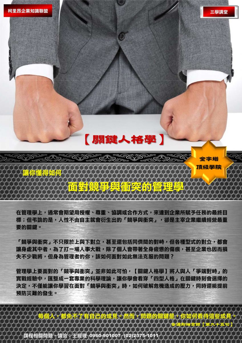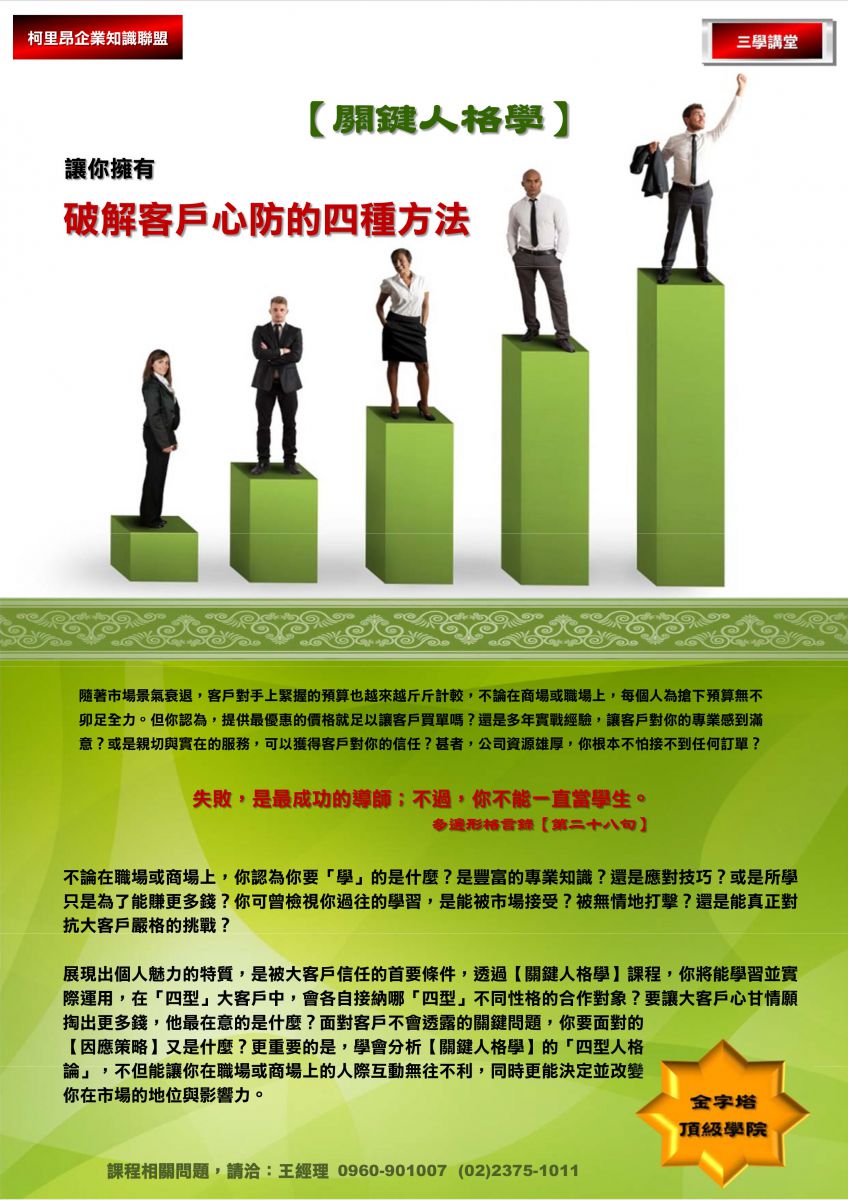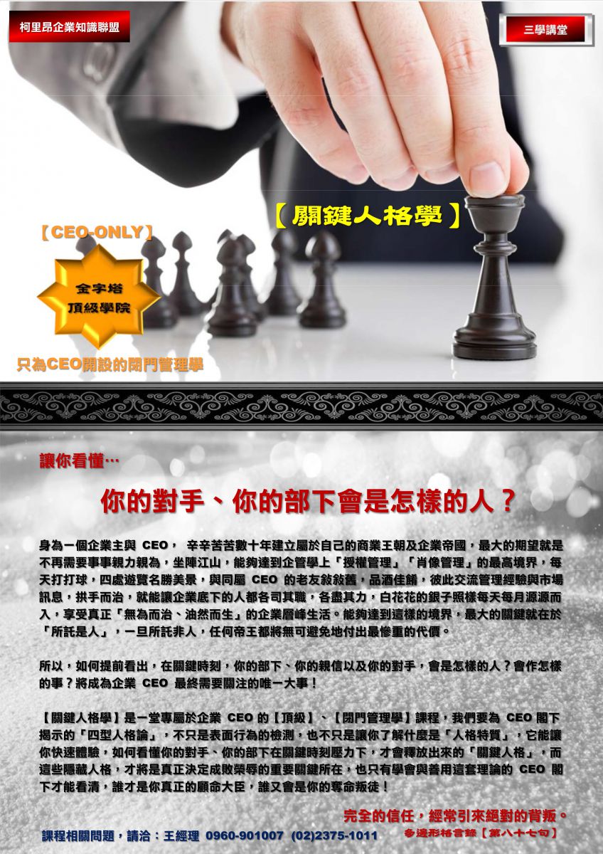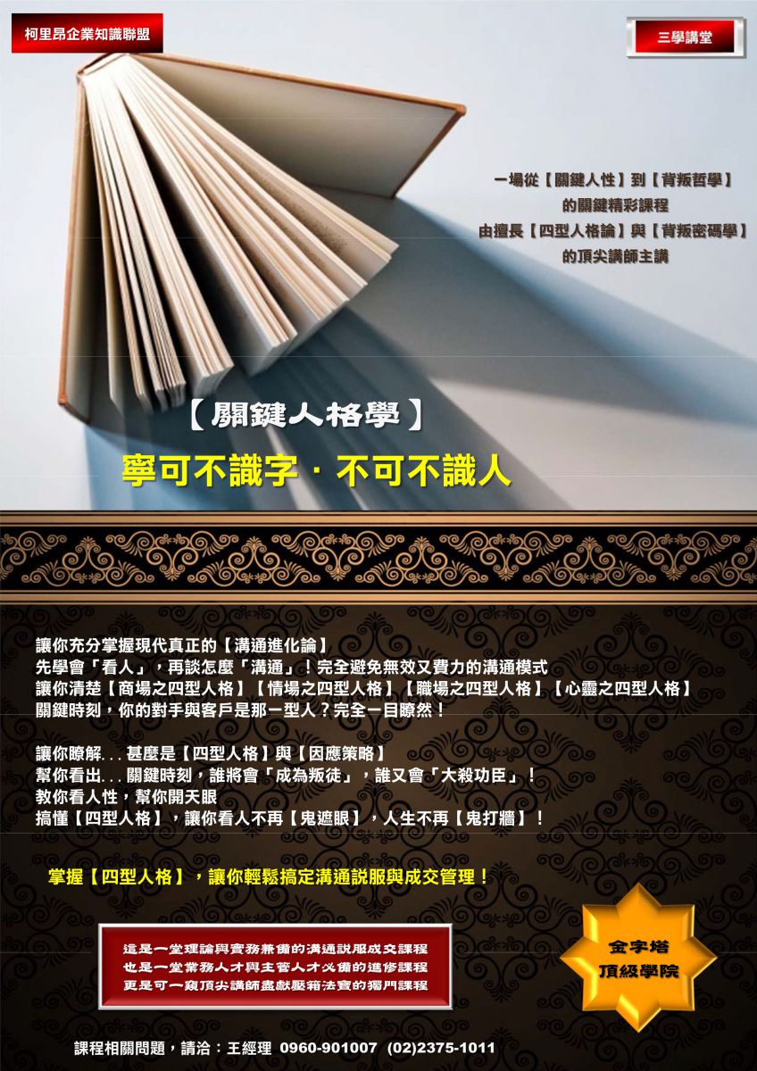 透過學習此課程,你可以提前預知,關鍵時刻,你的長官、部下、客戶甚至你的對手,會是怎樣的人?會作怎樣的事?