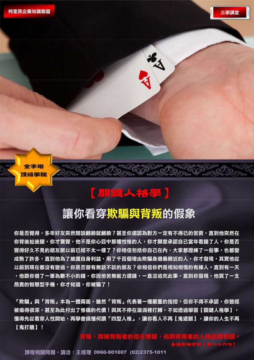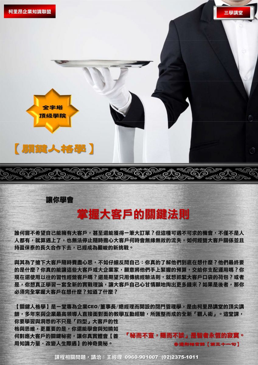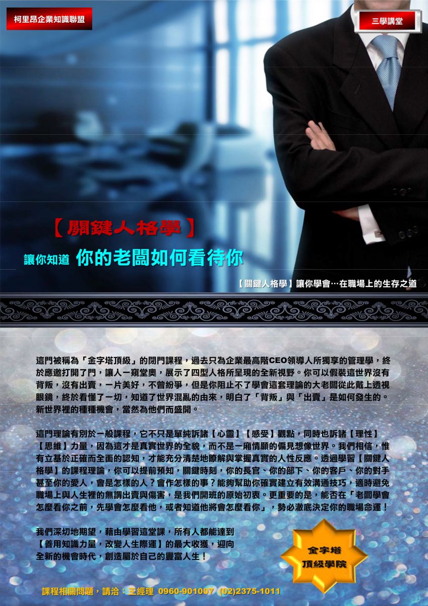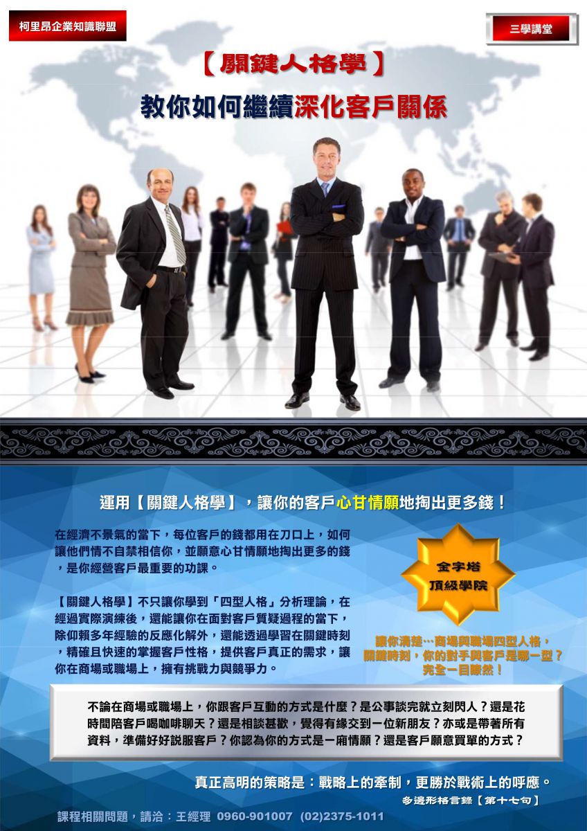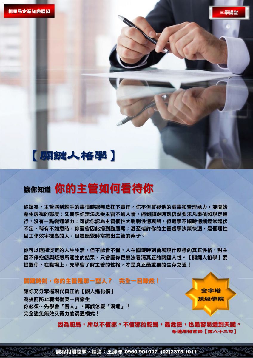 透過學習此課程,你可以提前預知,關鍵時刻,你的長官、部下、客戶甚至你的對手,會是怎樣的人?會作怎樣的事?